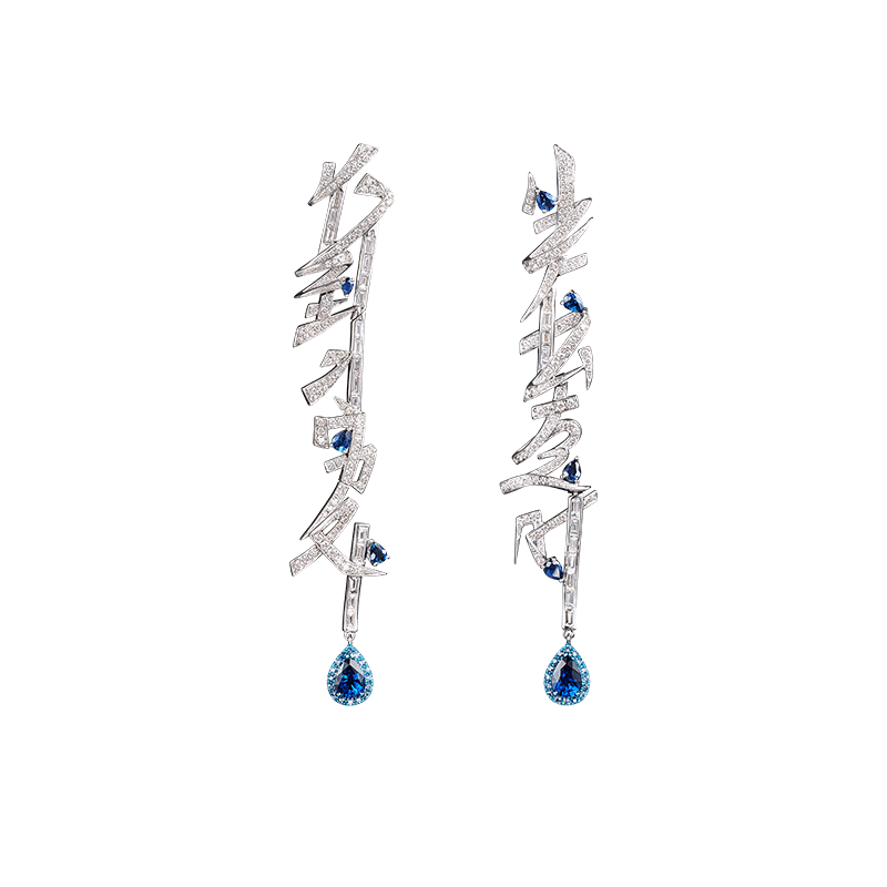圓形鑽石完美襯托梨形切割濃色藍寶石,藍白交錯散發撥雲見日般的光芒,與喃喃獨白的字體相互輝映,流瀉超然的垂墜感,為字裡行間的語意留下想像空間,蘊含代代相傳的寓意。