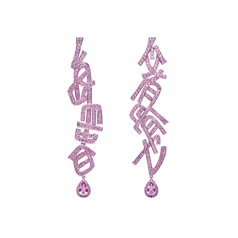 鼓腹飽滿的梨形粉色,象徵八面玲瓏的圓融處事態度。特殊延展的中文字體,除讓耳環更顯垂墜感外,也蘊含代代相傳的寓意。
